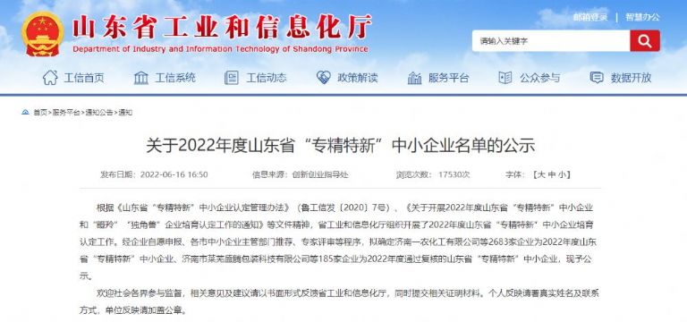 祝賀我公司獲得2022年度山東省“專精特